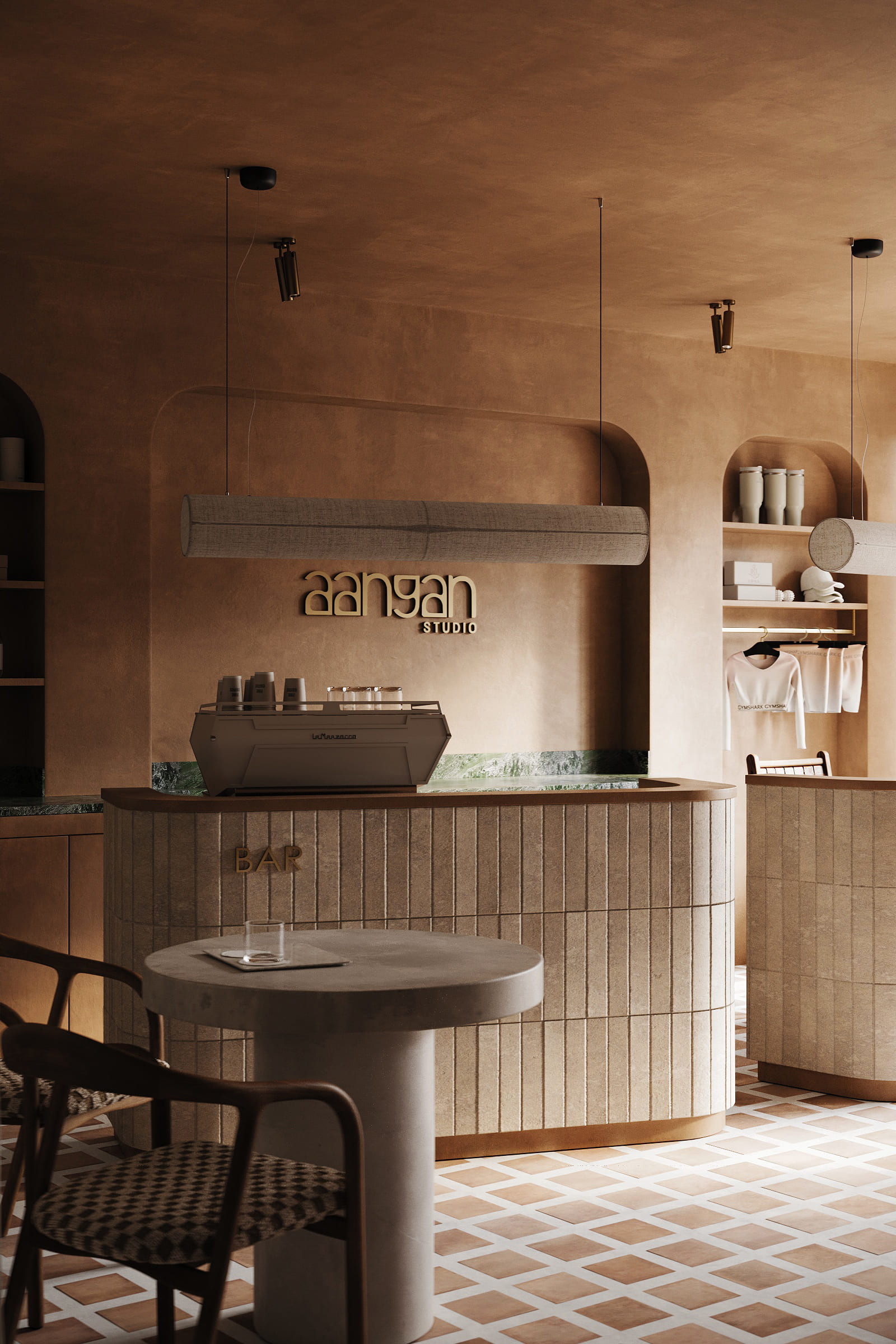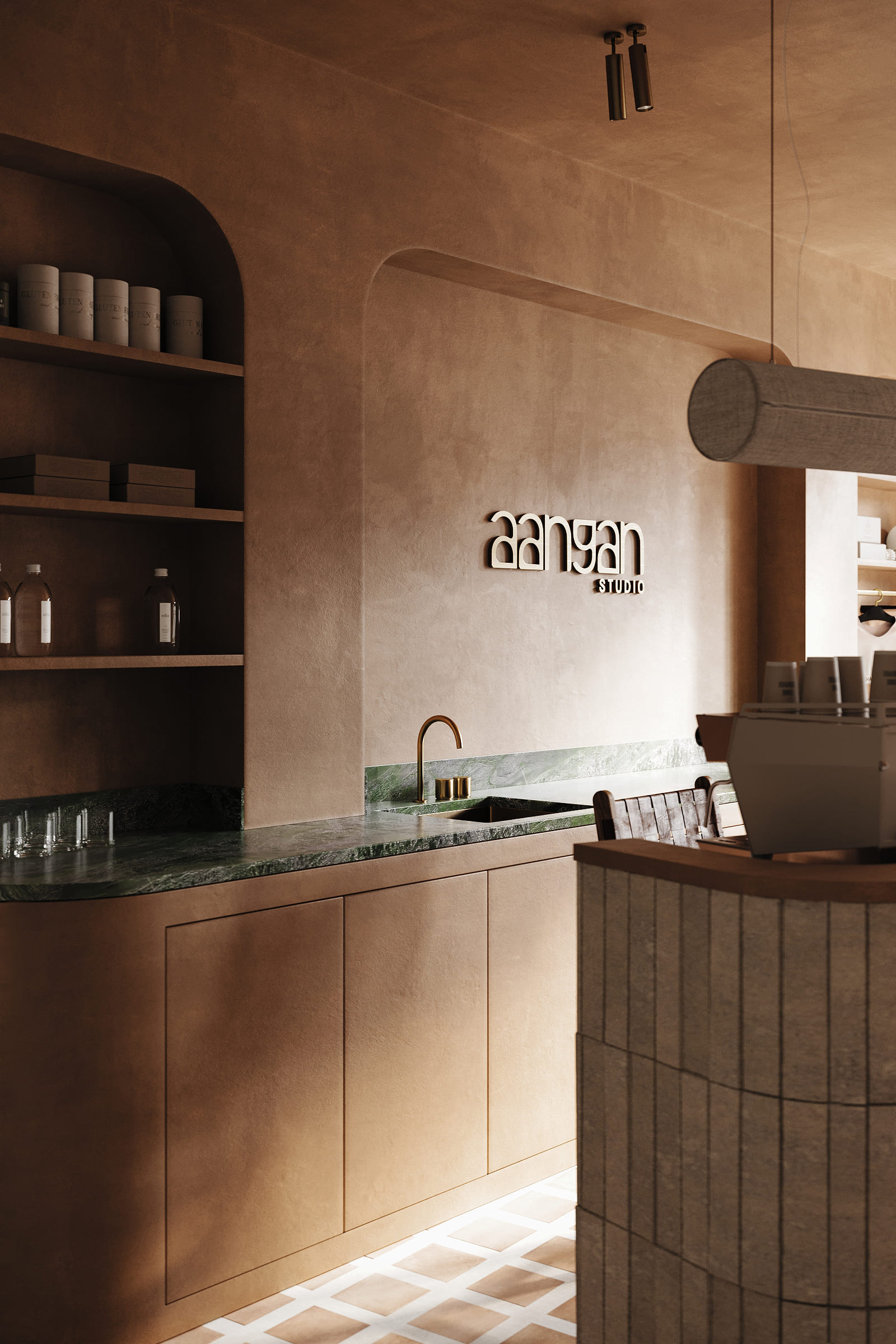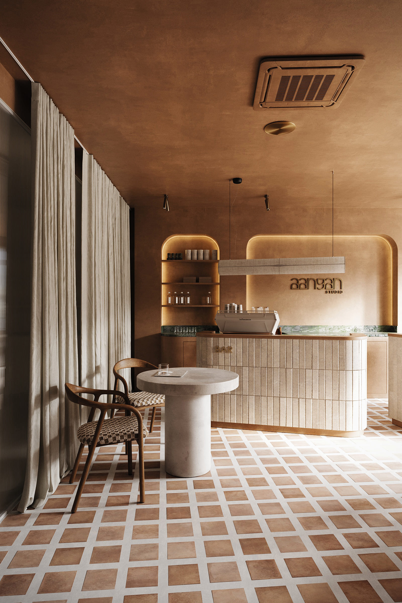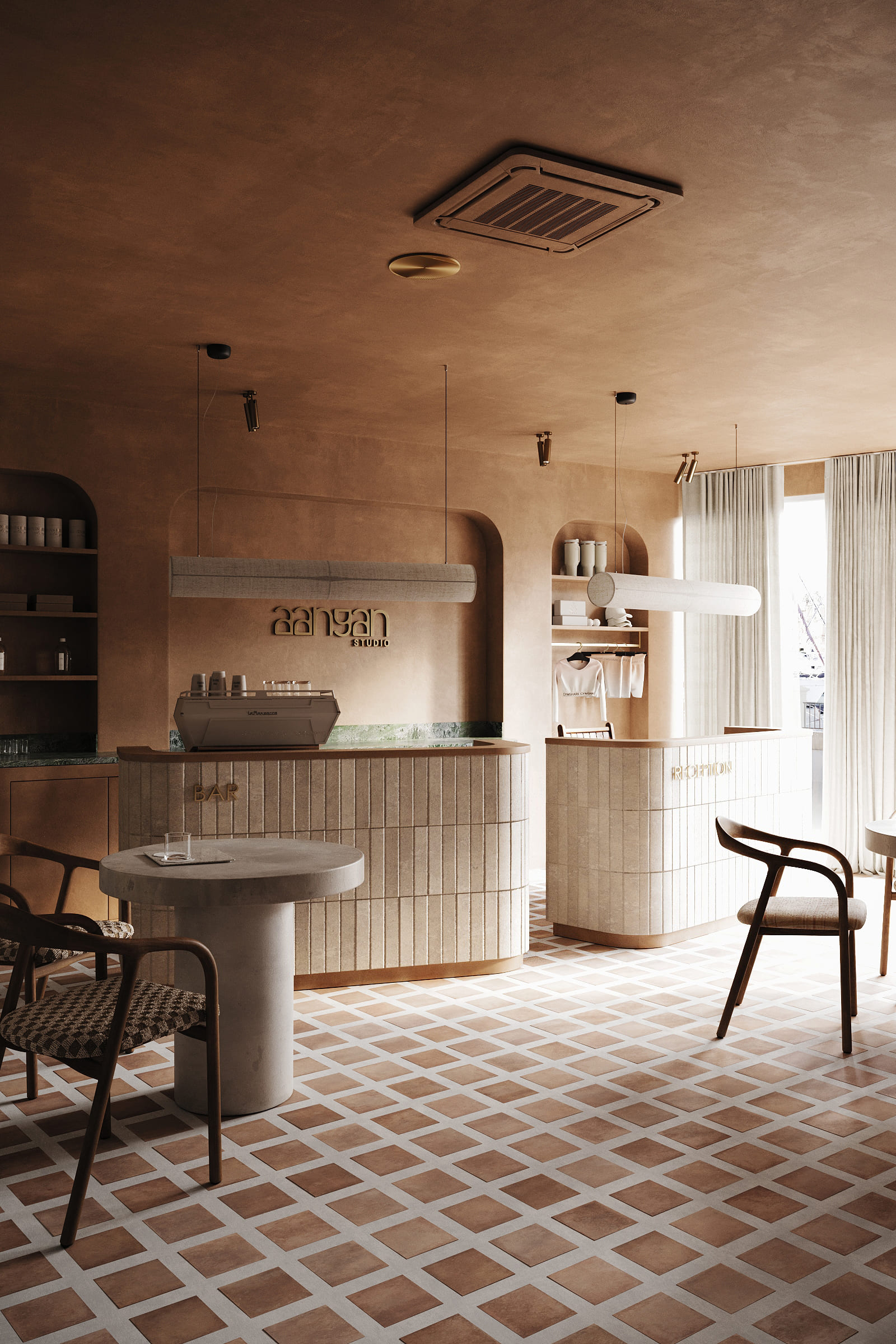 Aangan Studio is conceived as a modern interpretation of an Indian courtyard — a calm threshold between the outside world and a space of movement, breath, and presence.