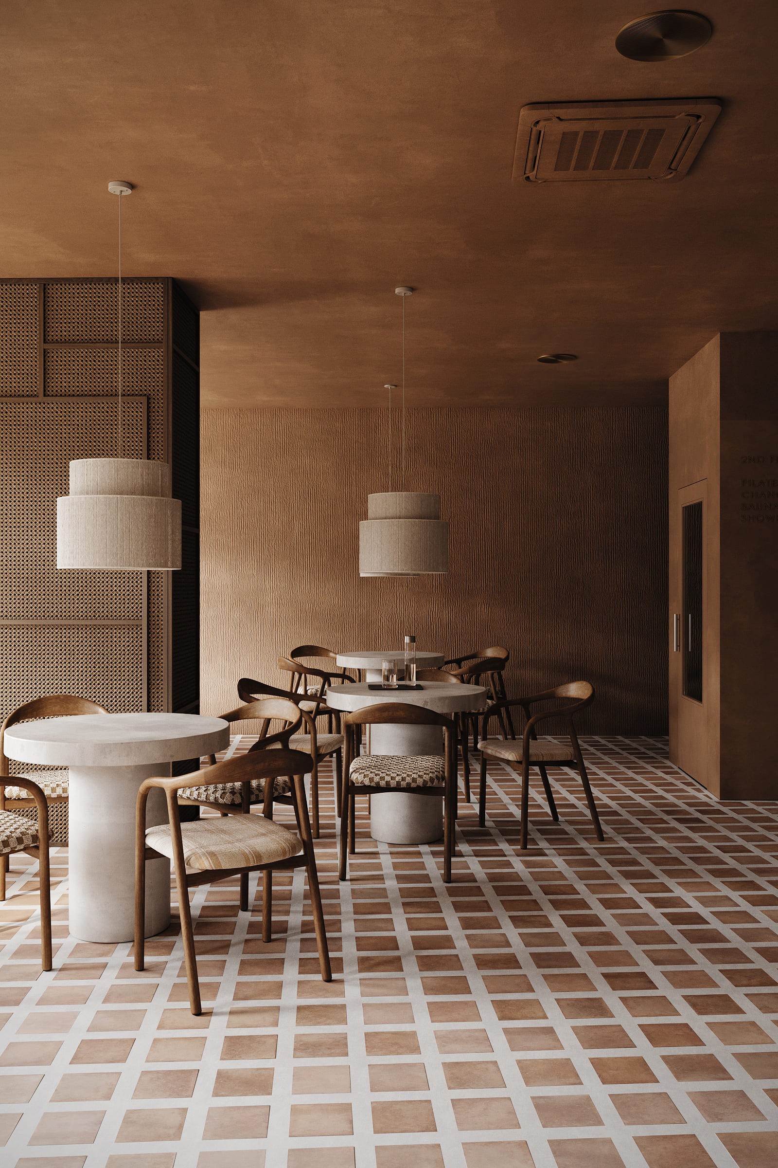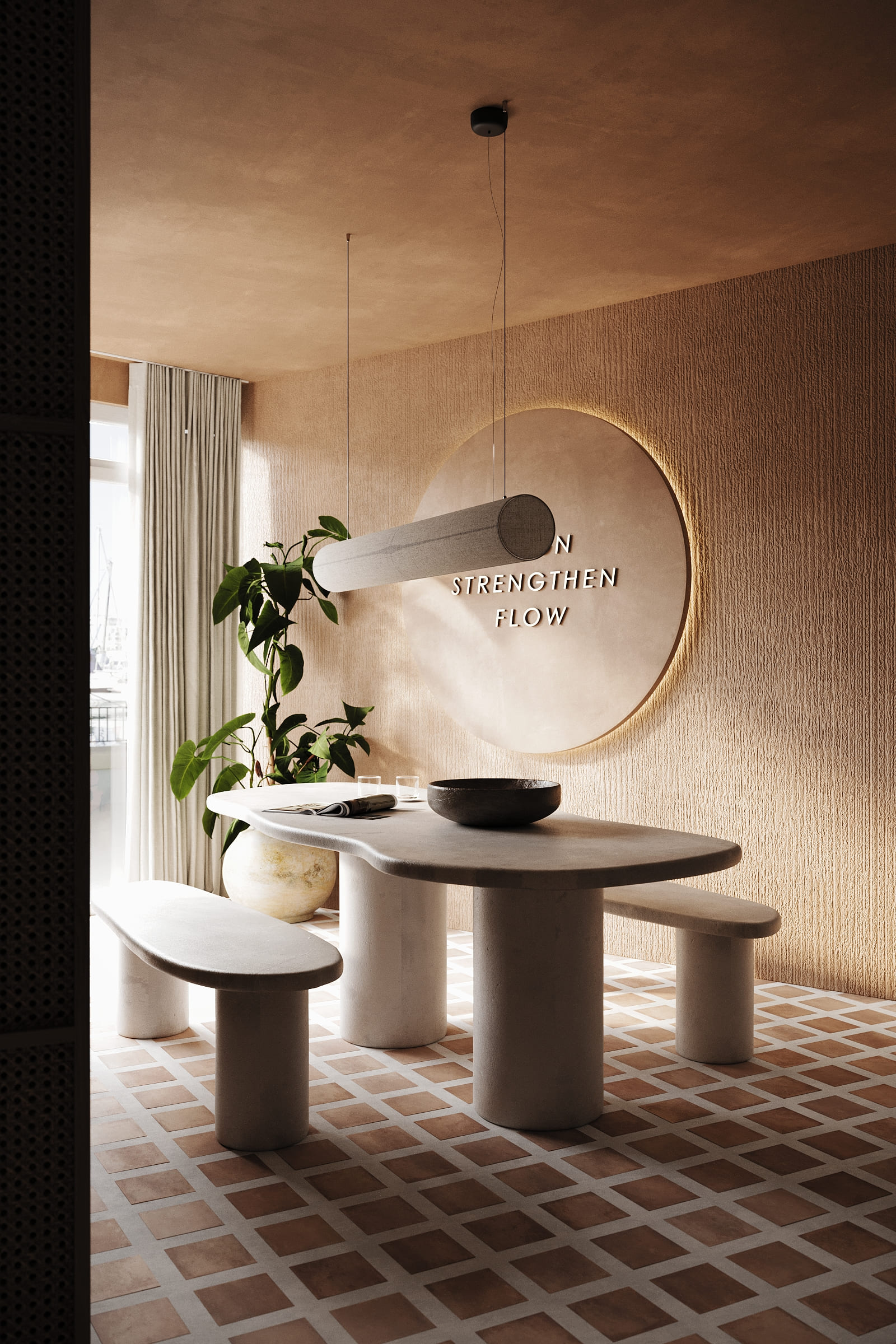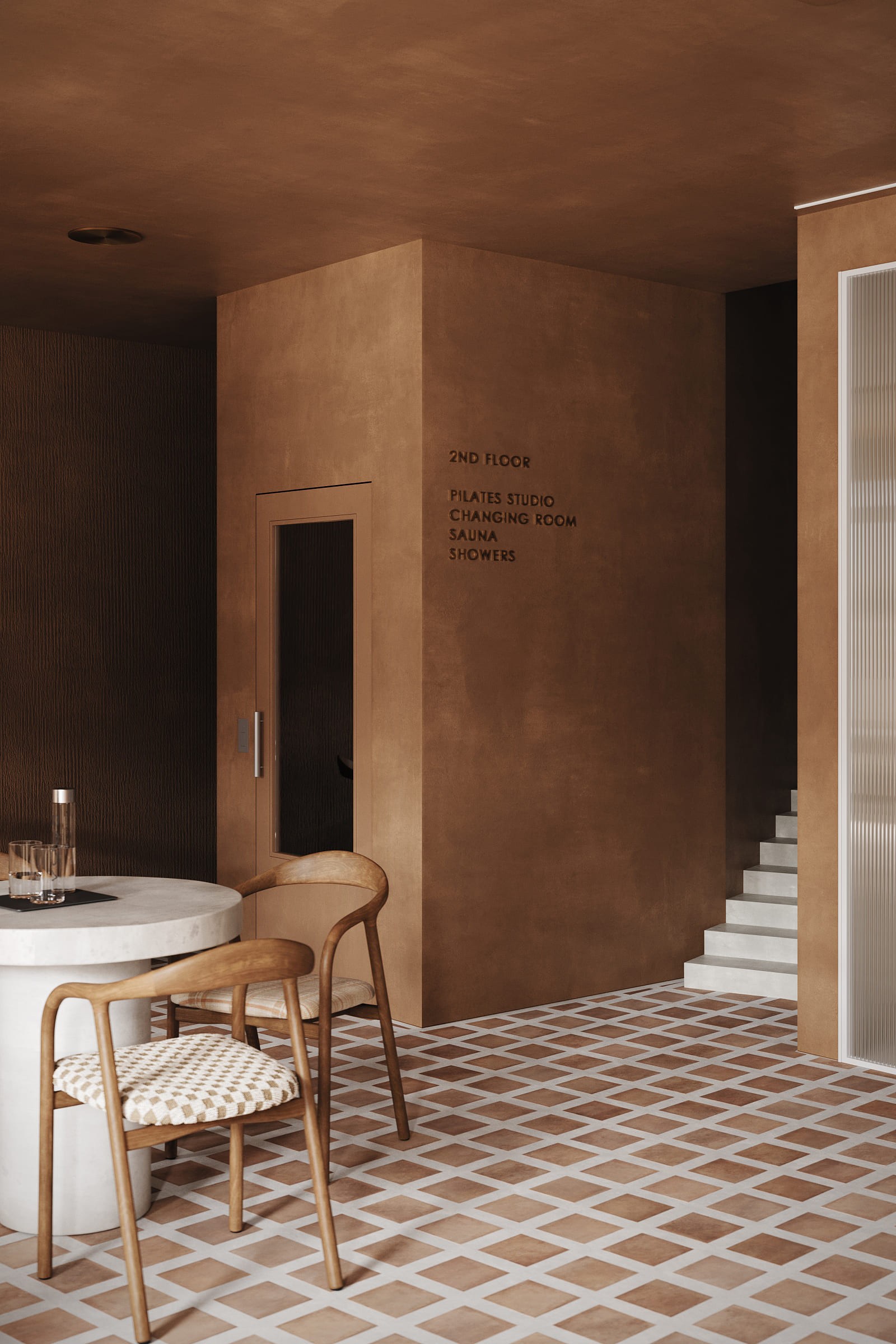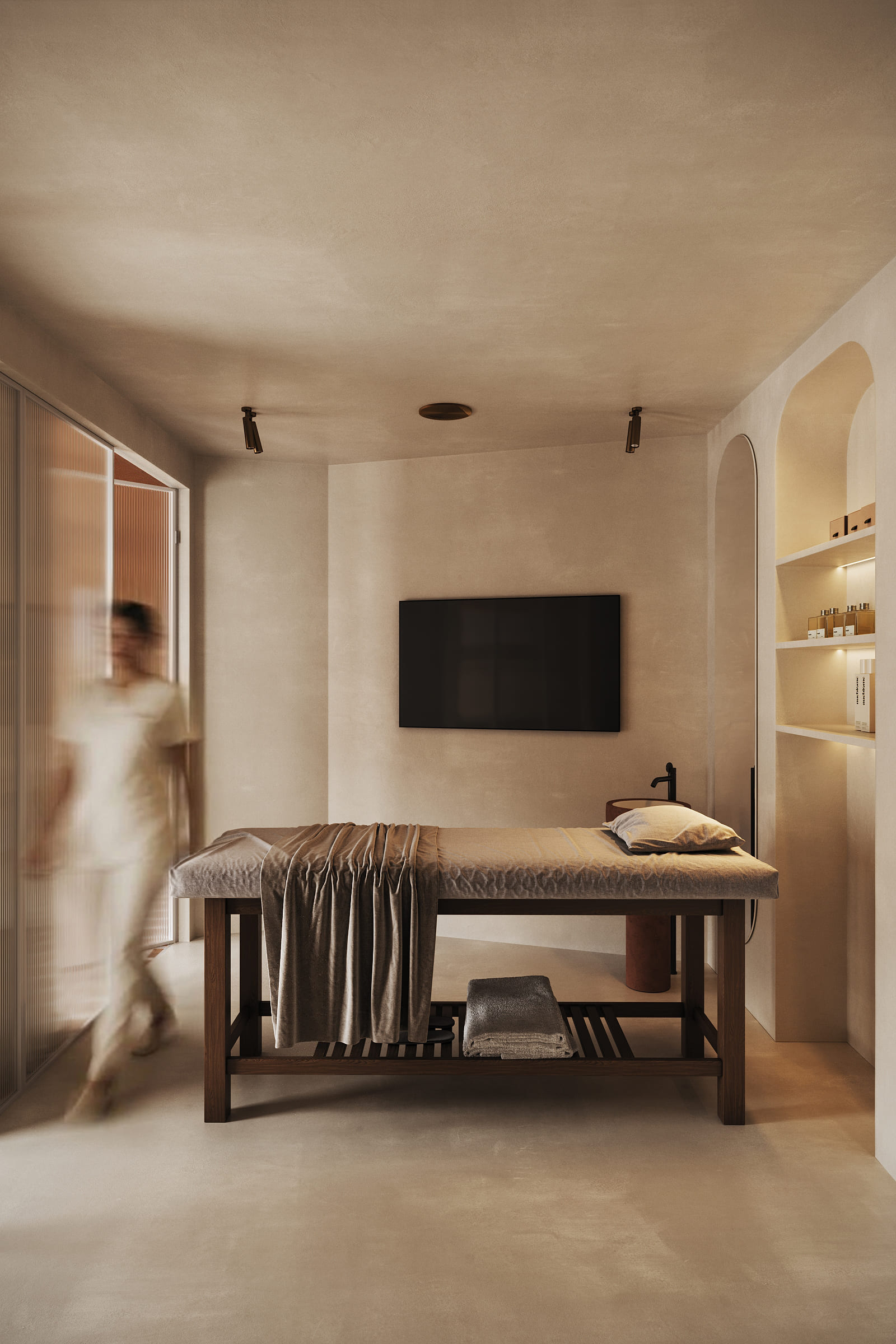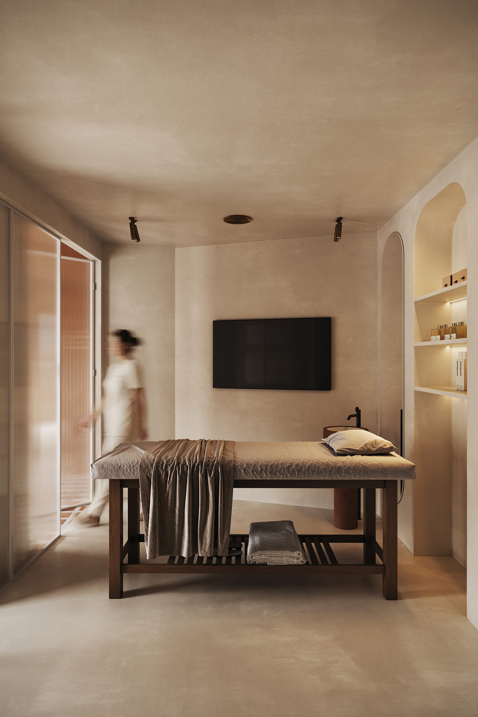 The design is grounded in natural materials and soft, earthy tones. Lime-washed walls, terracotta-inspired flooring, and sculpted stone elements create a warm, tactile environment, while curved forms and diffused lighting enhance a sense of softness and flow.