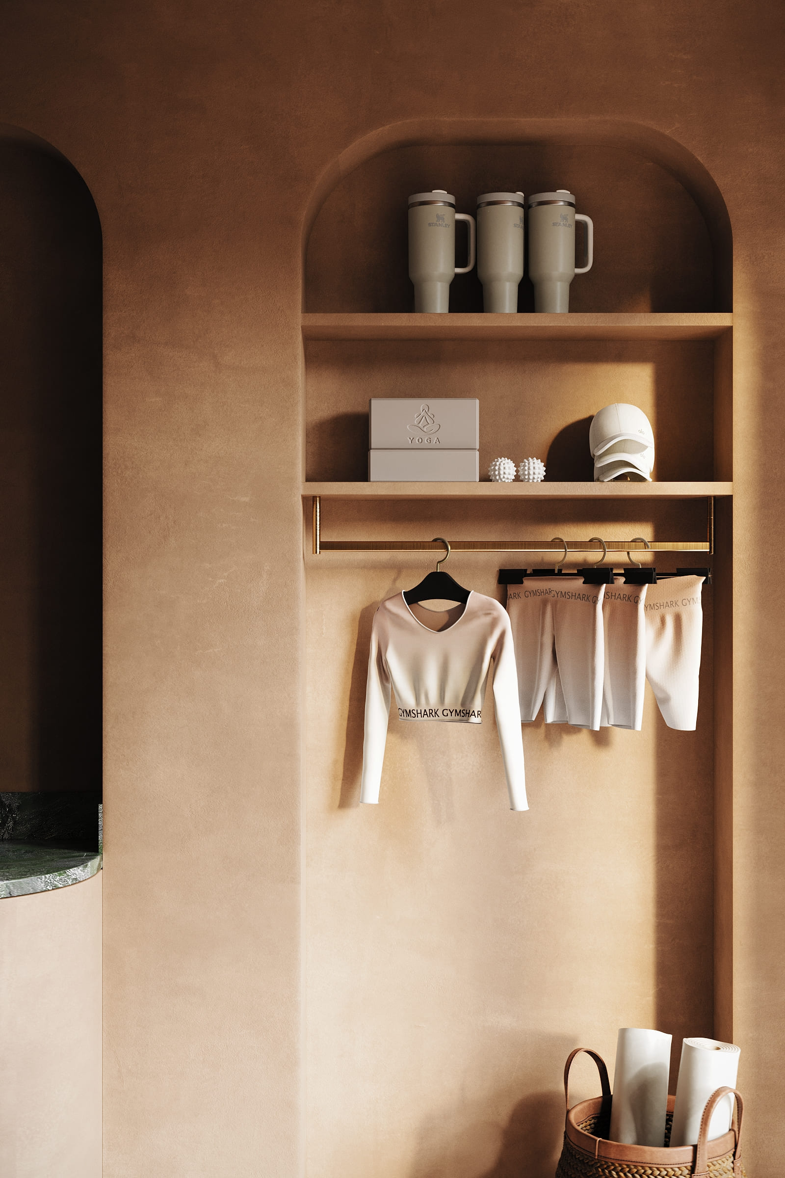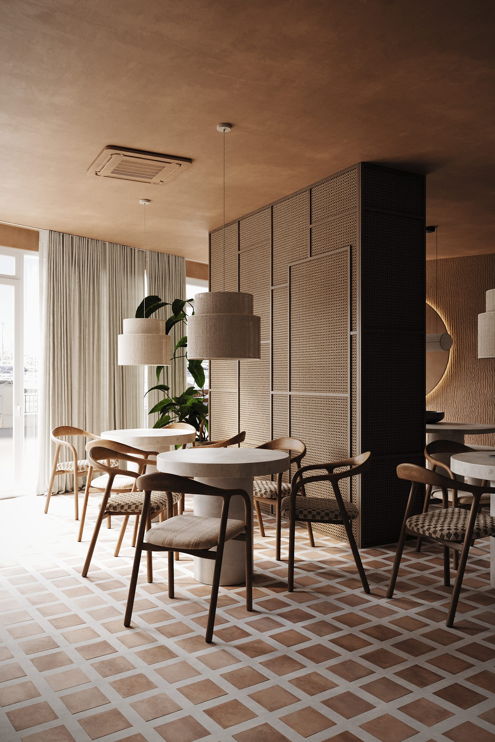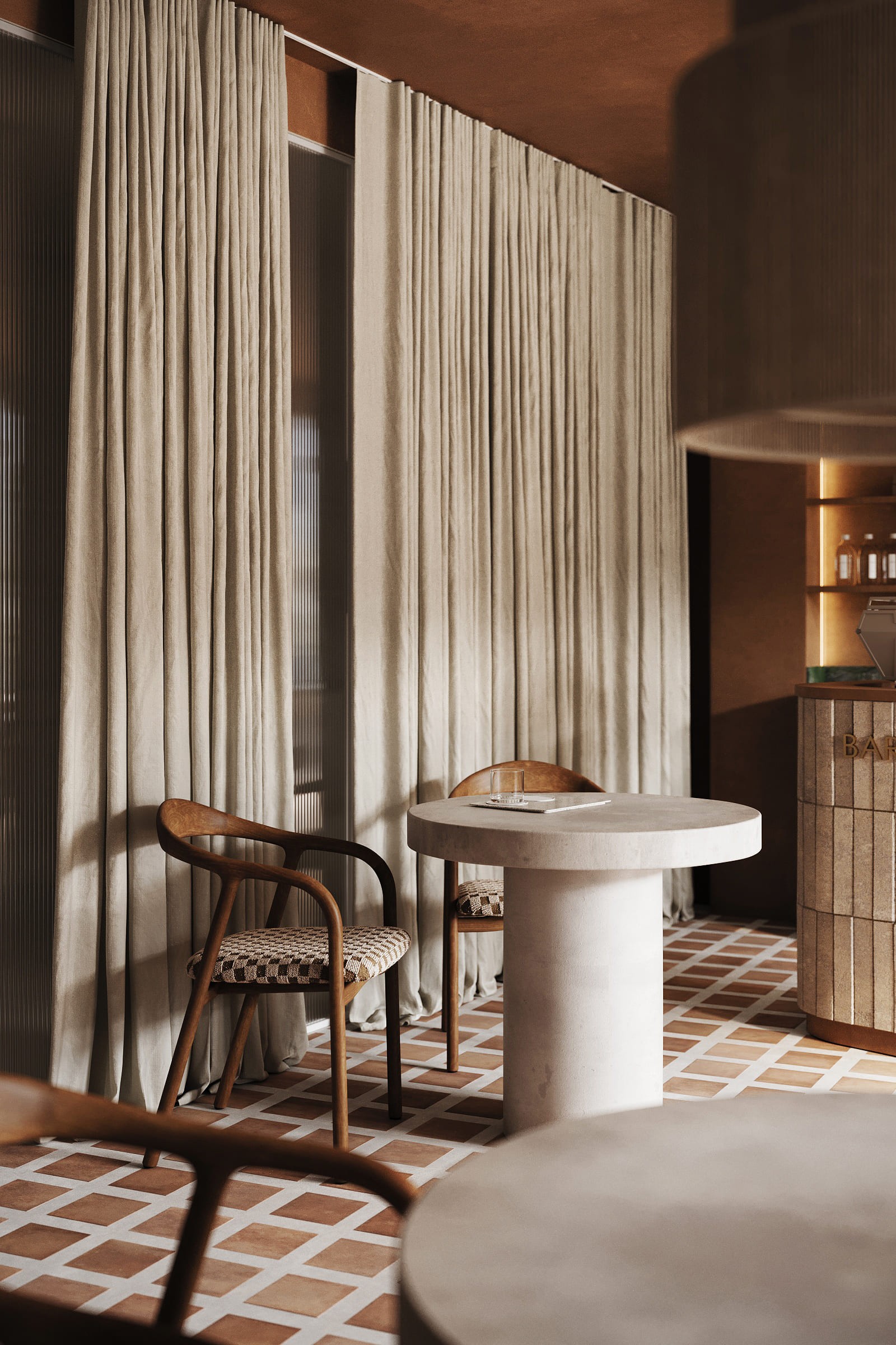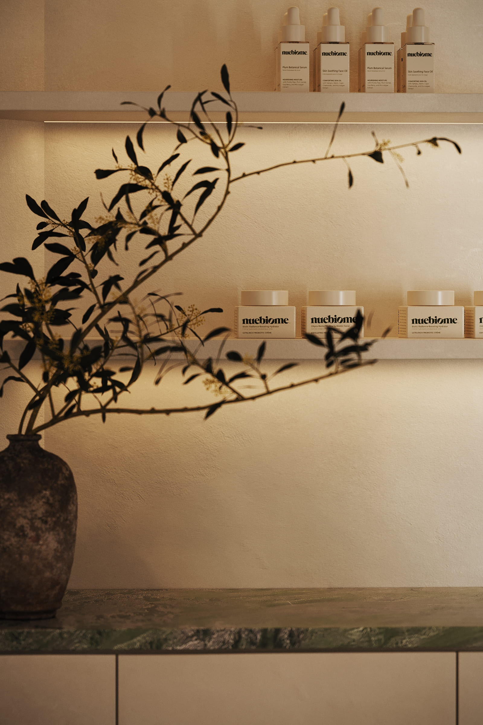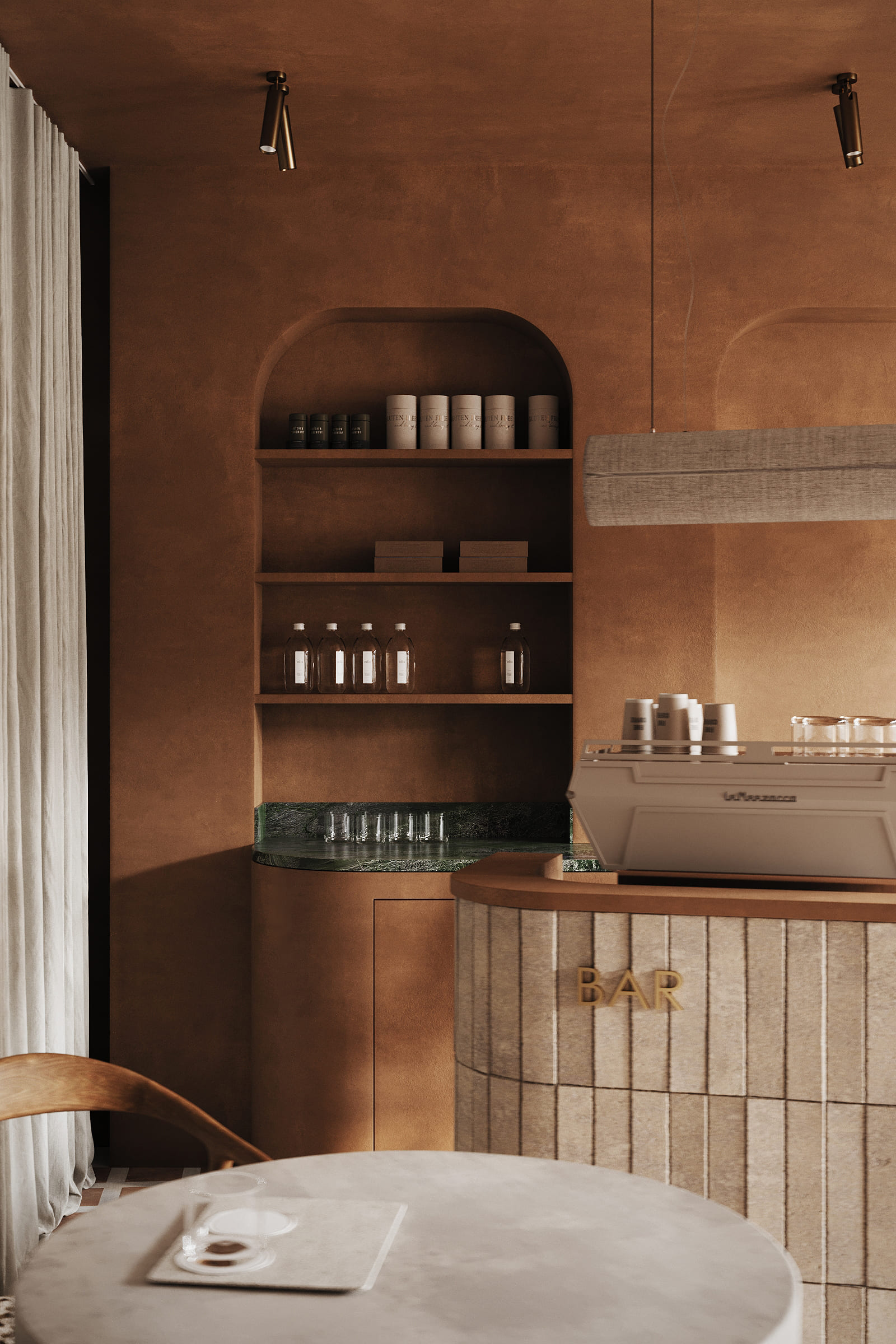 The design is grounded in natural materials and soft, earthy tones. Lime-washed walls, terracotta-inspired flooring, and sculpted stone elements create a warm, tactile environment, while curved forms and diffused lighting enhance a sense of softness and flow.