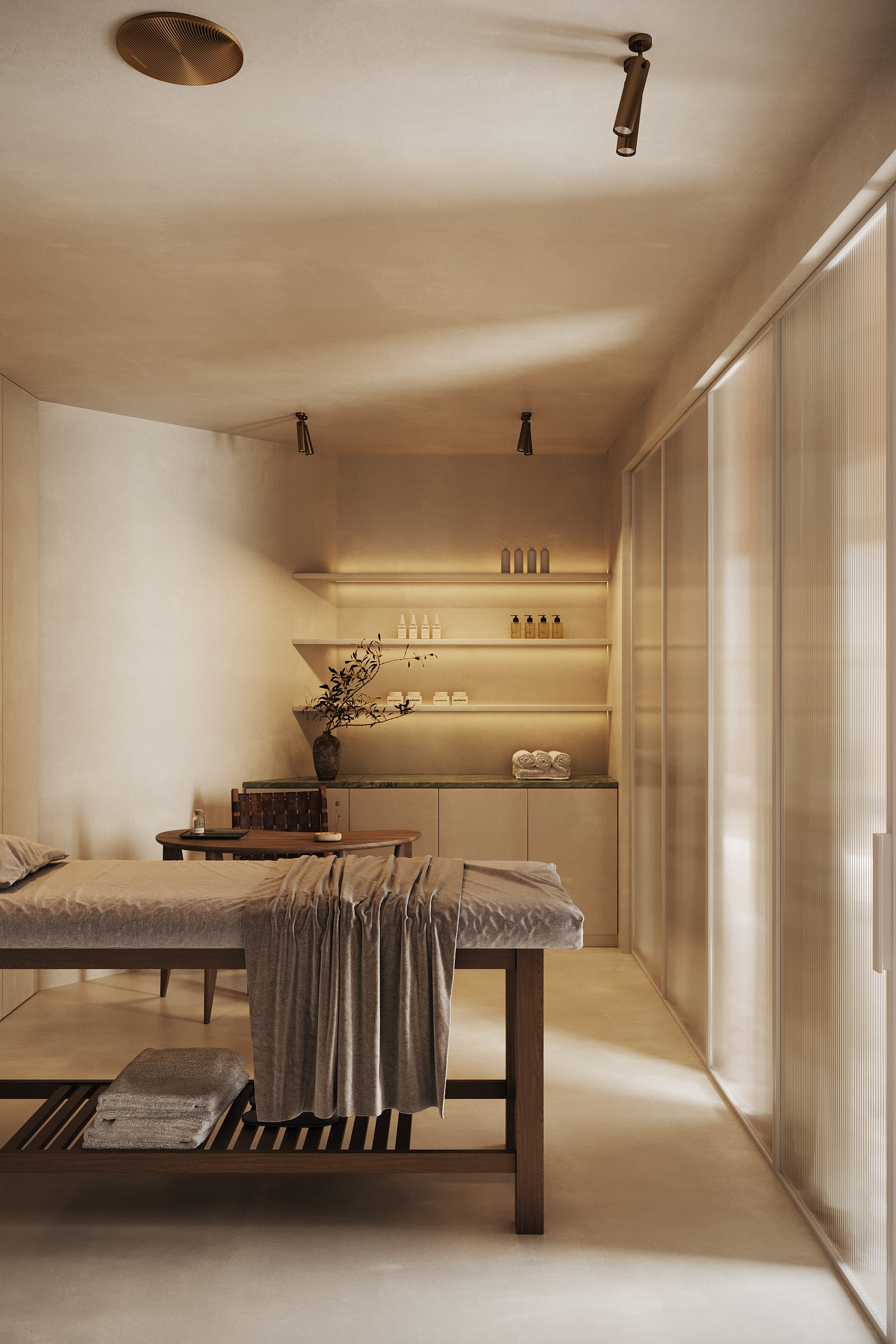 Subtle references to Indian craftsmanship are expressed through texture, rhythm, and materiality, rather than decoration. The result is a serene, contemporary wellness space that feels both rooted and refined.